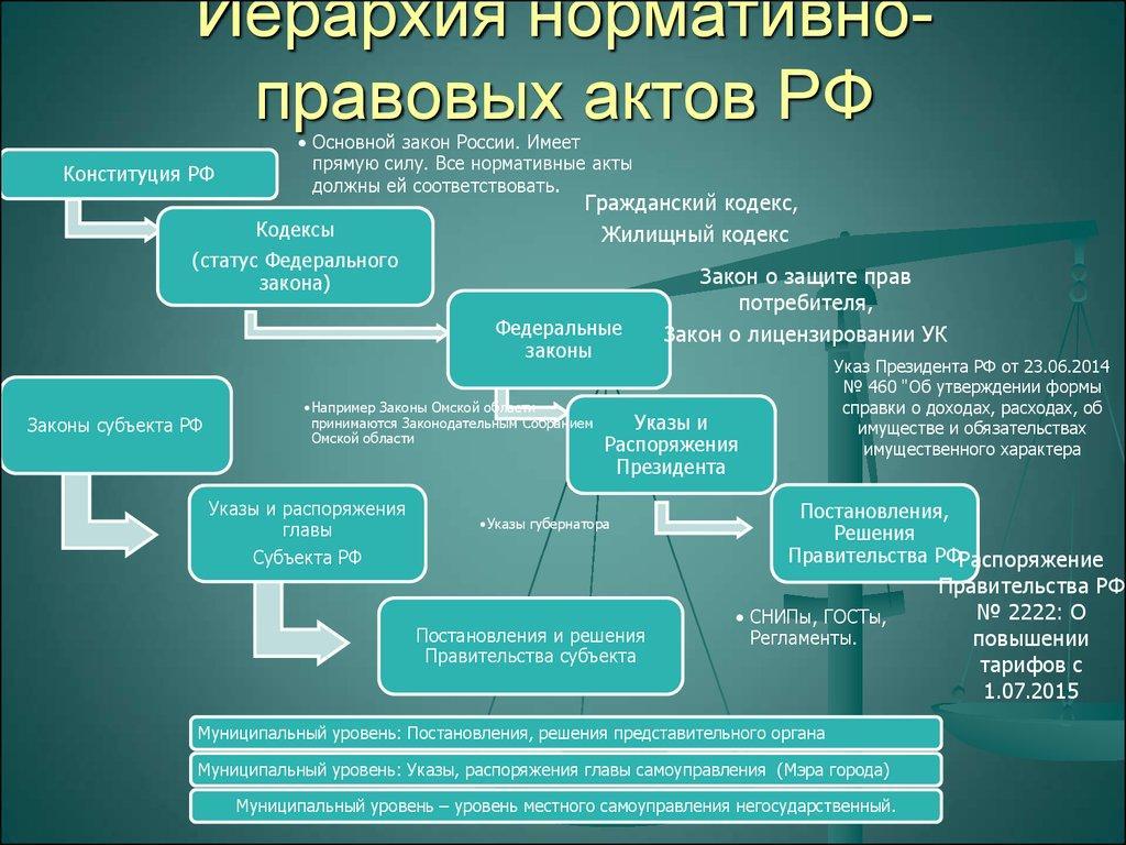 Конституция РФ - Федеральный конституционный закон и Федеральный закон (стоят на одном уровне) - Указ президента РФ - Постановление правительства РФ - Приказ МВД России - Устав г. Тюмени - Распоряжение мэра г. Тюмени.