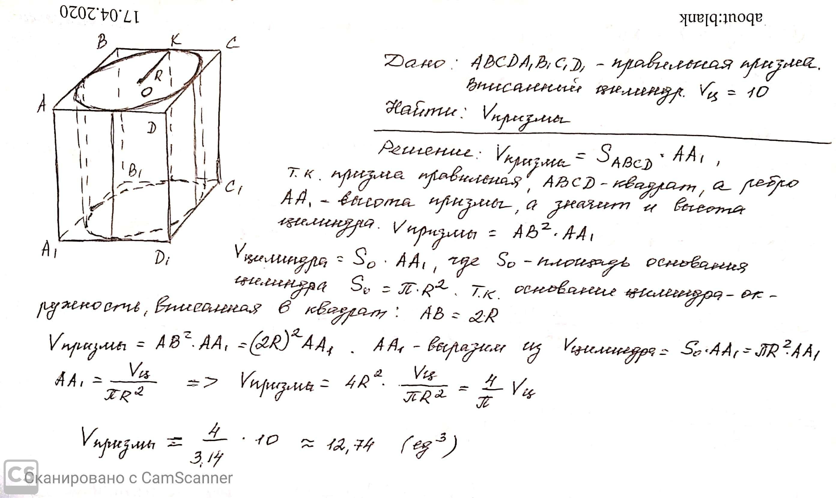 В правильную четырёхугольную призму вписан цилиндр. Объём цилиндра равен 10. Найти объём призмы.