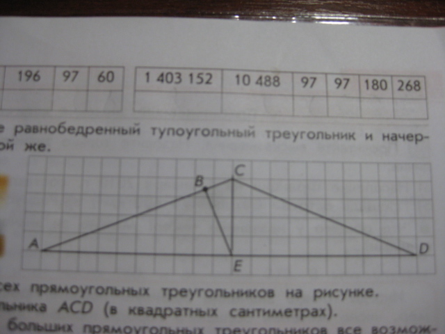 Выпиши название всех прямоугольных треугольников на рисурке. Найди площадь треугольника ACD (в квадр.см). Составь из двух самых больших прямоугольных треугольников всевозможные четырехугольники и начерти их.