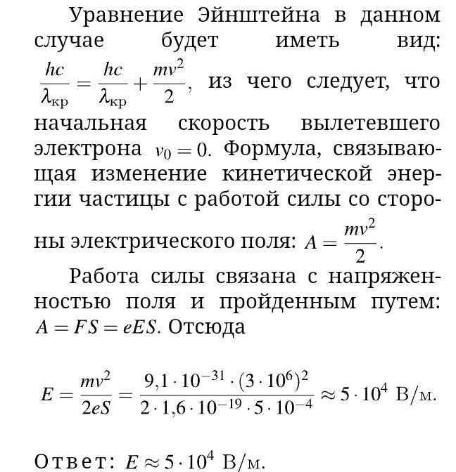 Фотон с длиной волны, соответствующей красной границе фотоэффекта, выбивает электрон из металлической пластинки (катода), помещенной в сосуд, из которого откачан воздух. Электрон разгоняется однородным электрическим полем напряженностью Е. Пролетев путь 5×10^-4 он приобретает скорость 3×10^6 м/с Какова напряженность электрического поля? Релятивистские эффекты не учитывать.