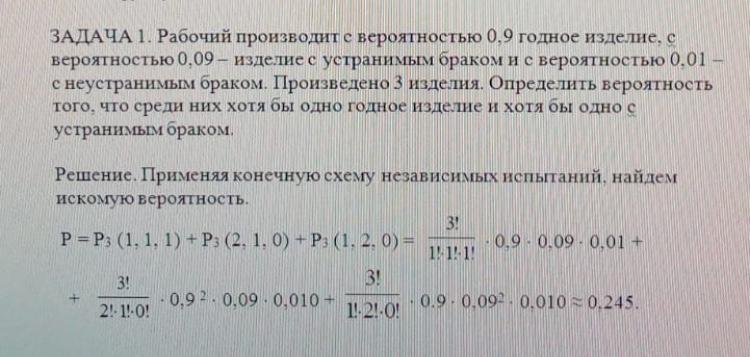 1.Рабочий производит с вероятностью 0,9 годное изделие, с вероятностью 0,09 – изделие с устранимым дефектом и с вероятностью 0,01 – с неустранимым дефектом. Произведено 4 изделия. Найдите вероятность того, что среди них 2 годных и хотя бы одно изделие с устранимым дефектом .