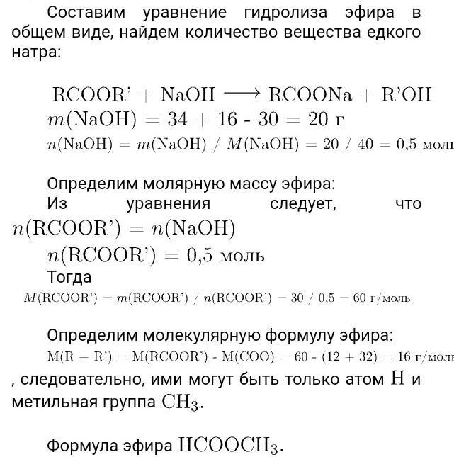 Cложный эфир массой 30 г подвергнут щелочному гидролизу. При этом получено 34 г натриевой соли предельной одноосновной кислоты и 16 г спирта. Установите молекулярную формулу этого эфира.