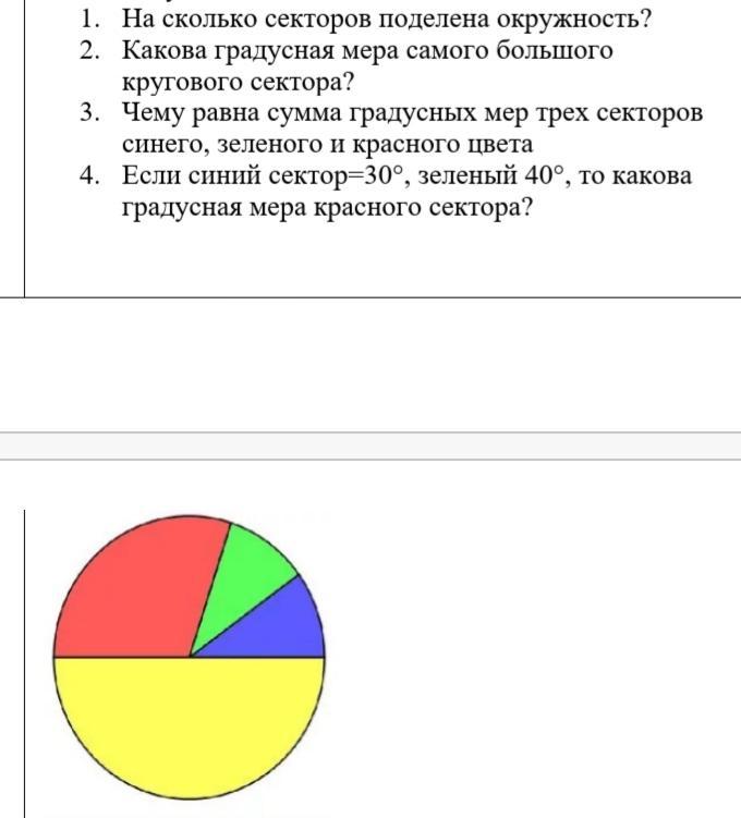 1) 4 сектора 2)180 градусов 3)360-180желтого=180 градусов занимают 3 сектора в вмести