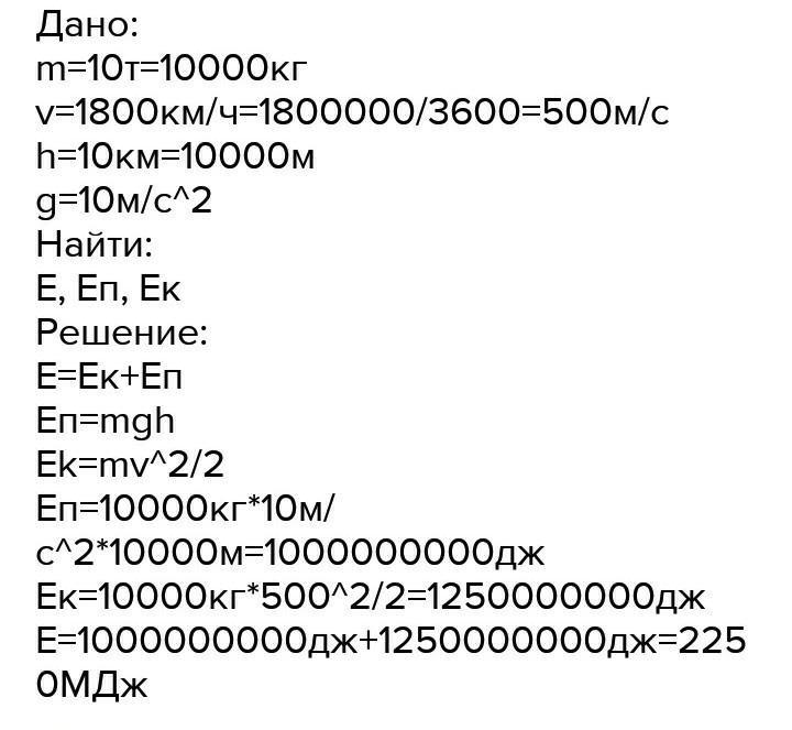 Самолет летит на высоте 10 км со скоростью 1800км\ч Найти полную энергию, если масса самолета 10т