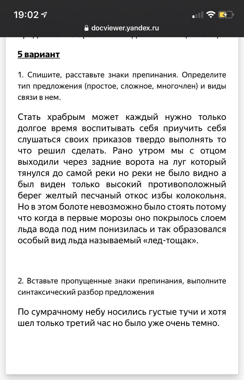 1.Стать храбрым может каждый.(простое(Нужно только долгое время воспитывать себя,приучать себя слушаться своих приказов,твердо выполнять то,что решил сделать (простое,осложнённое однородными членами).Рано утром мы с отцом выходили через задние ворота на луг,который тянулся до самой реки, но реки не было видно,а был виден только противоположный берег жёлтый песчаный,откос избы,колокольня(сложное,с разными видами связи,спп с придет опред+сочинение).Но в этом болоте невозможно было стоять,потому что когда в первые морозы оно покрылось слоем льда,вода под ним понизиласьи, и так образовался особый вид льда ,называемый "лед-тощак"(сложное.рвс,Спп с придаточным обст.причины,ССП,ССП)