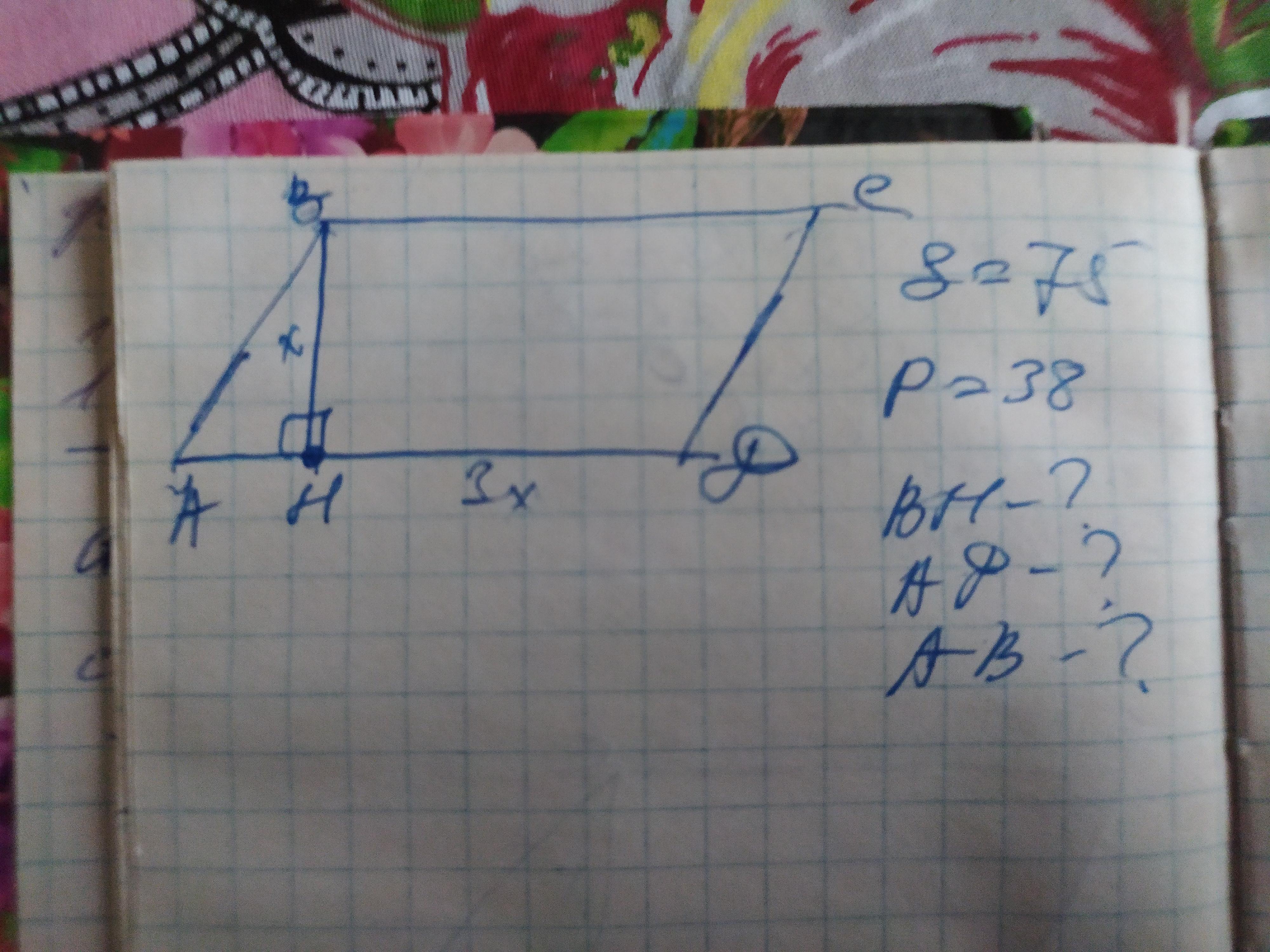 Объяснение: пусть высота ВН=х, тогда АD=3х. Так как S=BH×AD Составляем уравнение: