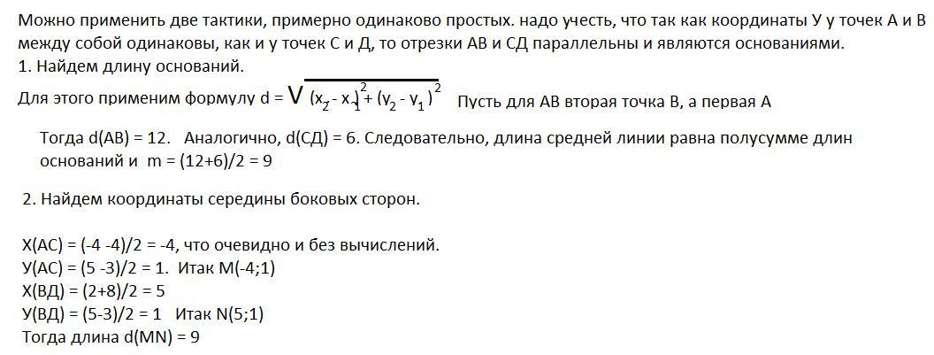 4. Точки A(-4;-3), C(-4;5), D(2;5), B(8;-3) - вершины прямоугольной трапеции с основаниями АВ и DC. Найдите длину средней линии.