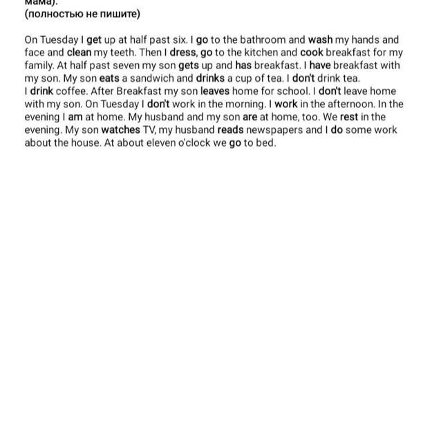 On Tuesday I got up at half past six. I went to the bathroom and washed my hands and face and cleaned my teeth. Then I dressed, went to the kitchen and cooked breakfast for my family. At half past seven my son got up and had breakfast. I had breakfast with my son. My son ate a sandwich and drank a cup of tea. I didn't drink tea. I drank coffee. After breakfast my son left home for school. I didn't leave home with my son. On Tuesday I didn't work in the morning. I worked in the afternoon. In the evening I was at home. My husband and my son were at home, too. We rested in the evening. My son watched TV, my husband read newspapers and I did some work about the house. At about eleven o'clock we went to bed.