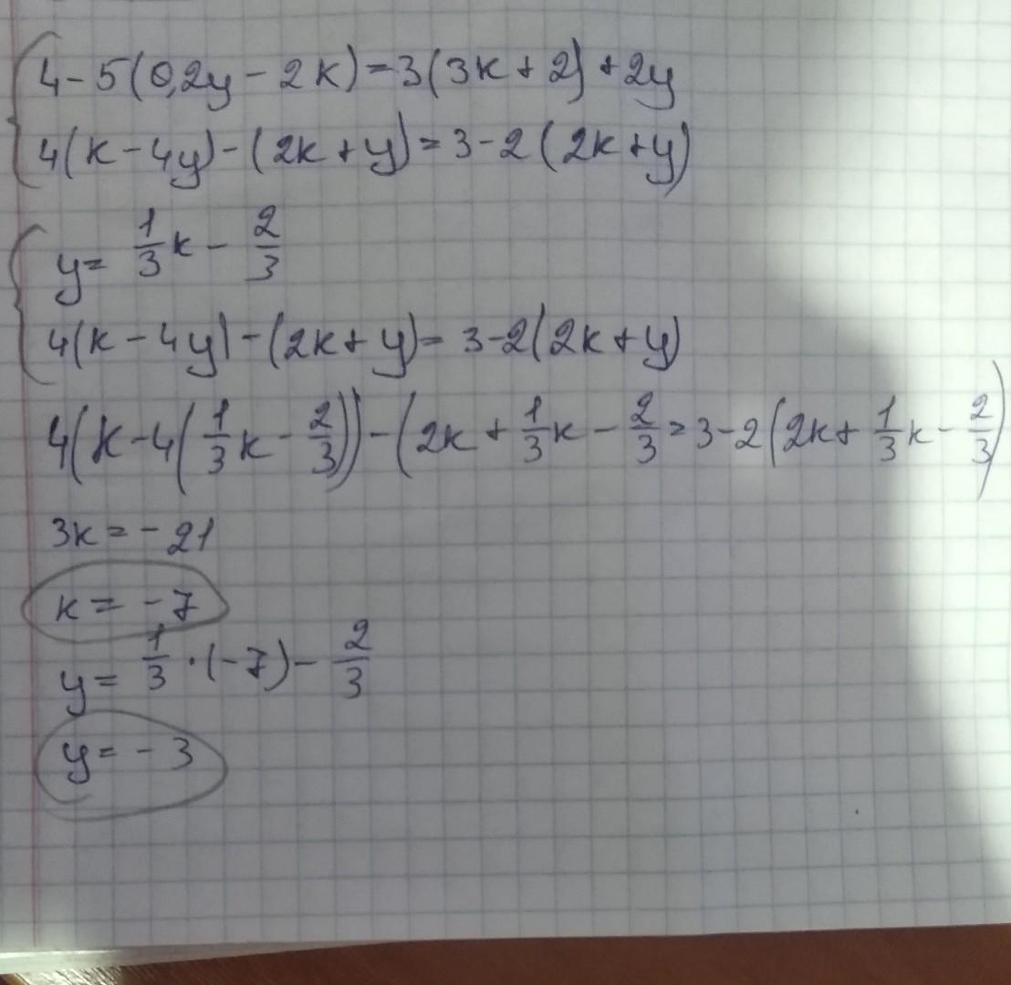 {4−5(0,2y−2k)=3(3k+2)+2y