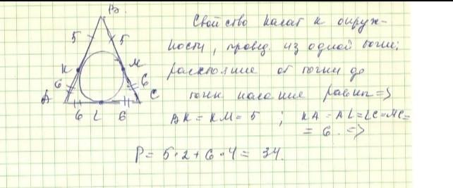 В равнобедренный треугольник АВС с основанием АС вписана окружность, причем М - это точка касания, которая делит одну из боковых сторон на отрезки длиной 4 и 5 см. Тогда периметр треугольника АВС равен:
