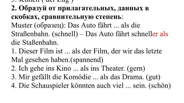 Muster (образец): Das Auto fährt ... als die Straßenbahn. (schnell) – Das Auto fährt schneller als die Staßenbahn.