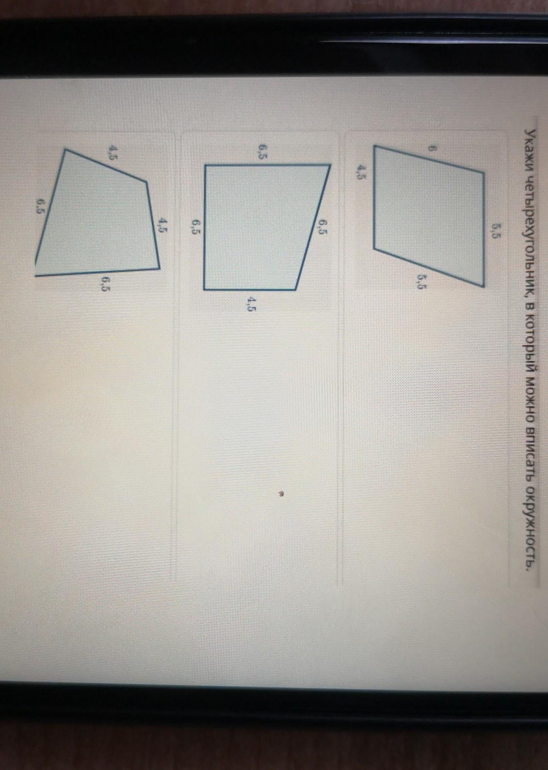 Для того, чтобы можно было вписать в 4-угольник окружность, сумма противоположных сторон должна быть равна сумме других противоположных сторон. Для первого случая: 6 + 5,5 ≠ 4,5 + 5,5, поэтому вписать в него окружность нельзя. Для остальных рекомендую посчитать суммы самостоятельно и ответить на вопрос.
