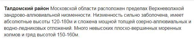 Талдомский район Московской области расположен пределах Верхневолжкой зандрово-аллювиальной низменности. Низменность сильно заболочена, имеет абсолютные высоты 120-180м и сложена мощной толщей озерно-аллювиальных и водно-ледниковых отложений. Много невысоких плоско-вершинных моренных холмов и гряд высотой 150-160м.
