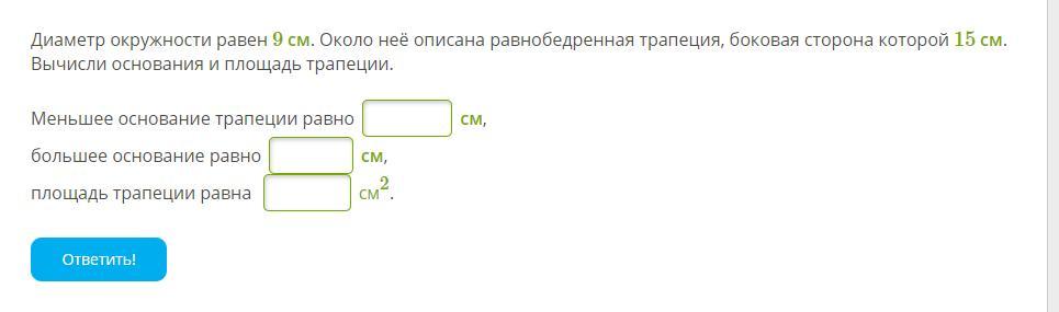 Диаметр окружности равен 9 см. Около неё описана равнобедренная трапеция, боковая сторона которой 15 см.