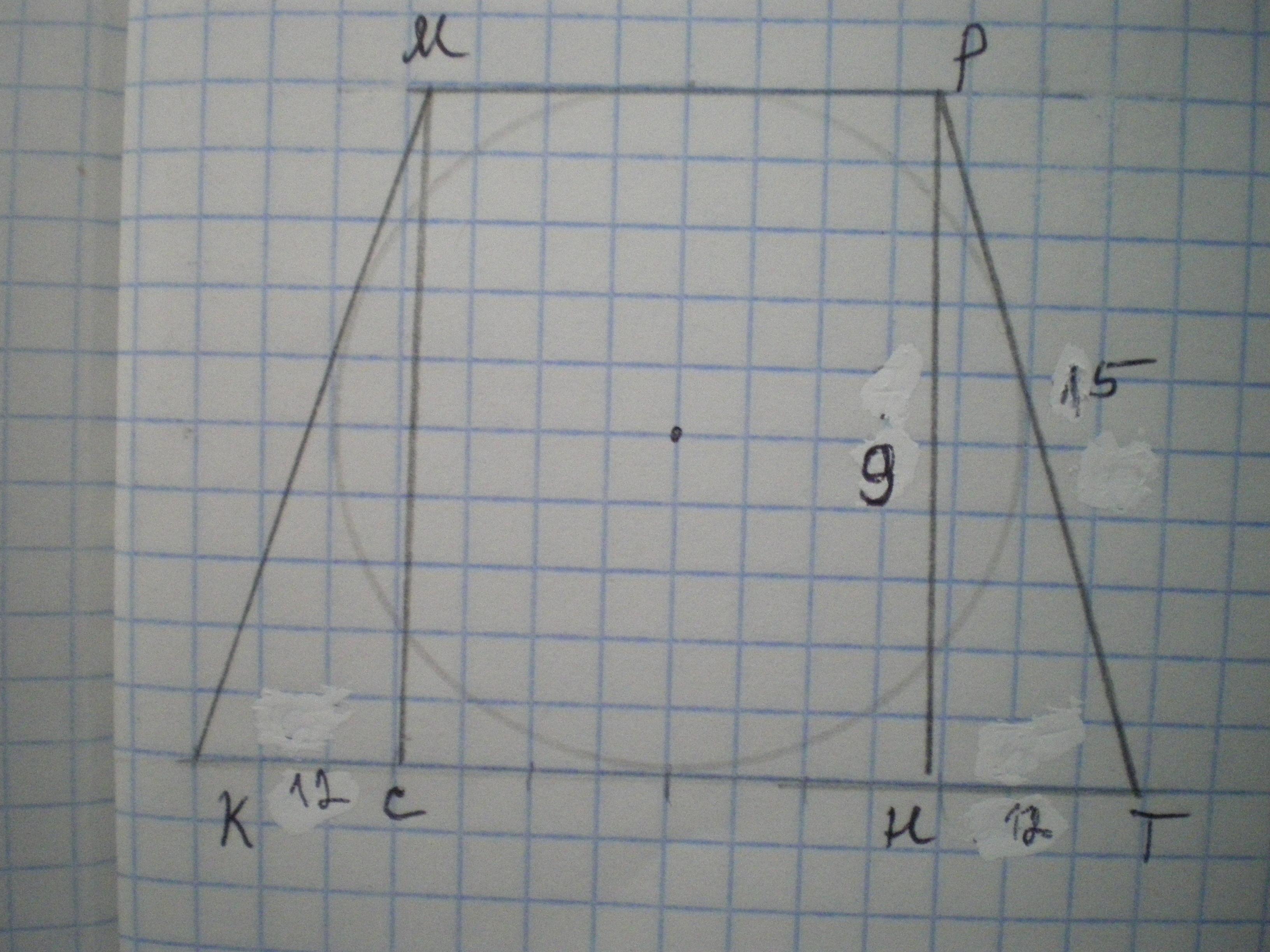 Если вокруг трапеции можно описать окружность, значит сумма боковых сторон равна сумме оснований трапеции. По условию КМ=РТ=15 см, КМ+РТ=МР+КТ=15+15=30 см.. Высота РН=D=9 см