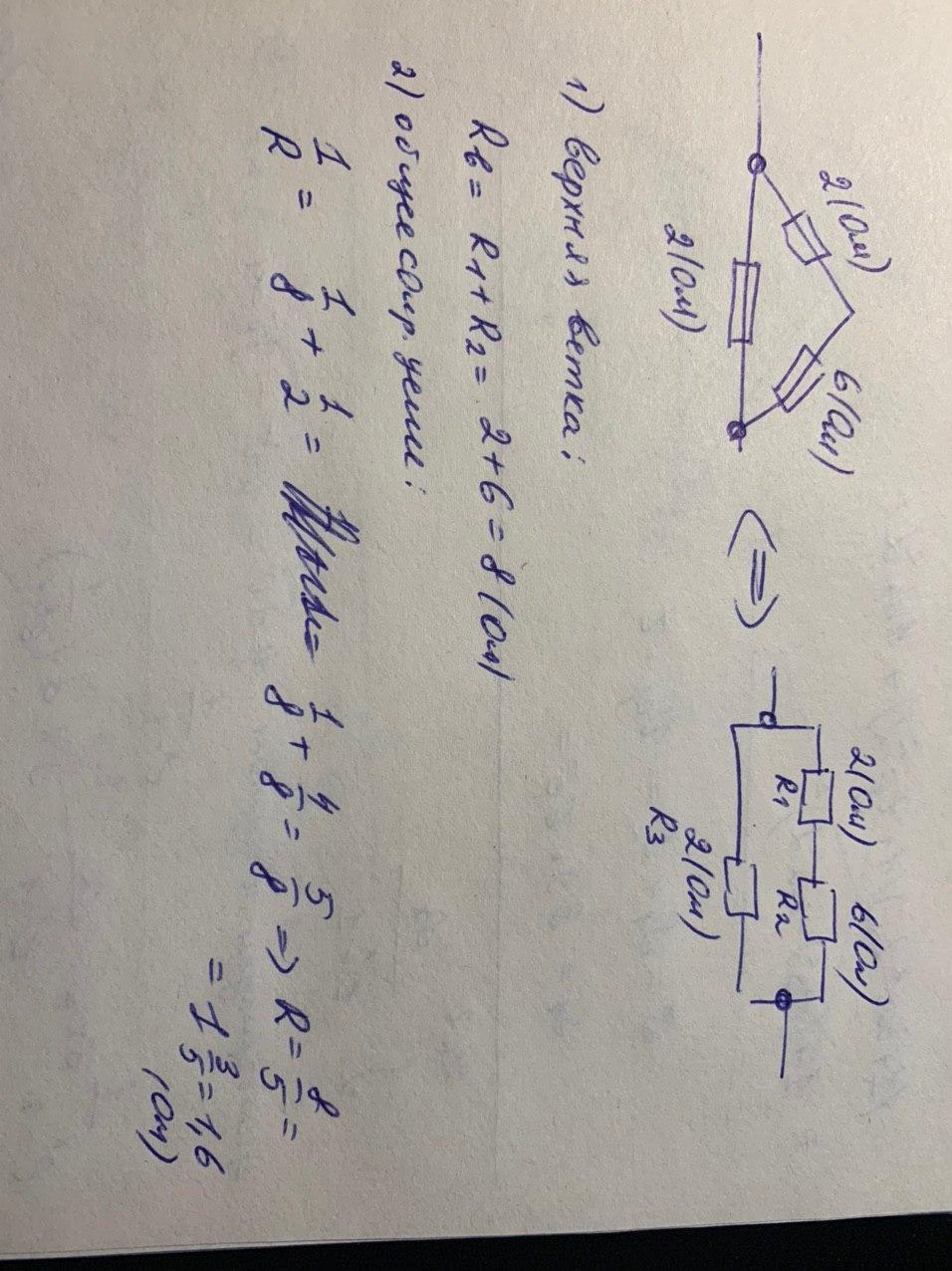 Секрет задачи в том, что верхние два резистора (идущие по бокам треугольника) по сути находятся в одной ветке. И сопротивление этой ветки представляет собой просто сумму этих сопротивлений.