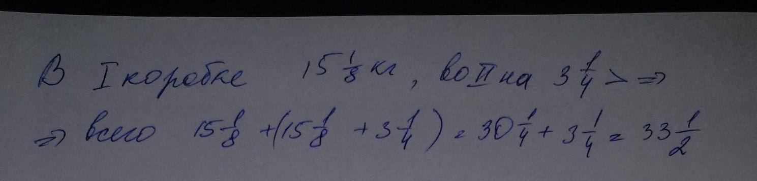 в двух коробках = 15 1/8 + 18 3/8 = 33 4/8 = 33 1/2
