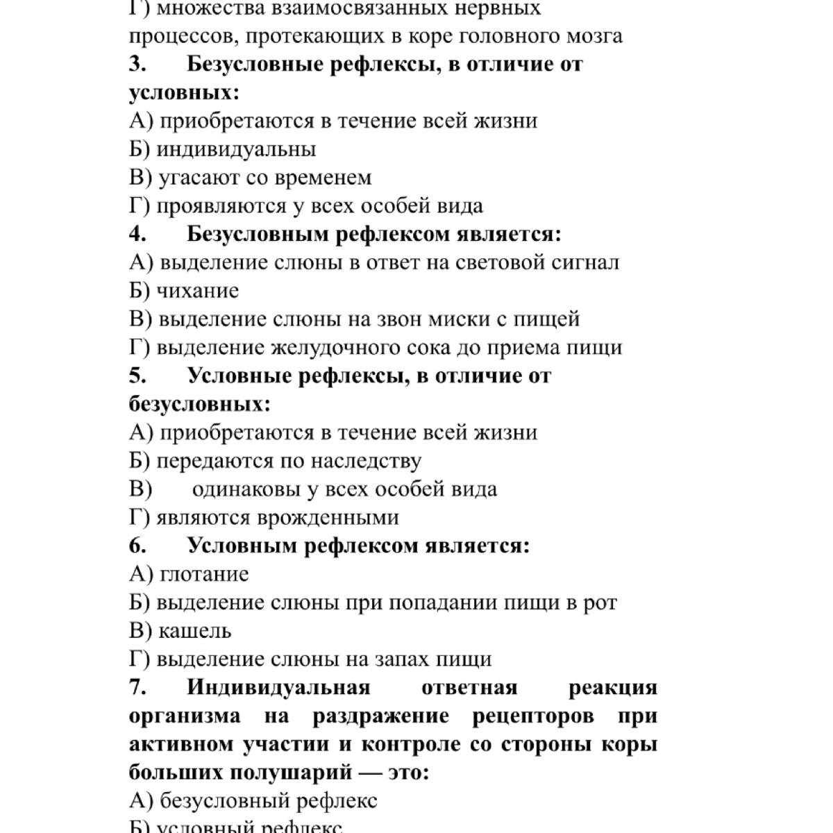 Безусловные рефлексы -то , что есть даже у маленьких деток, это будет на протяжении всей жизни ( чихание, глотание, кашель, пищеварение).Это контролируется спинным мозгом