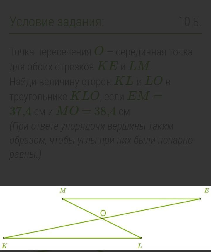 1. сторона LO в треугольнике KLO равна стороне в__ треугольнике EMO;