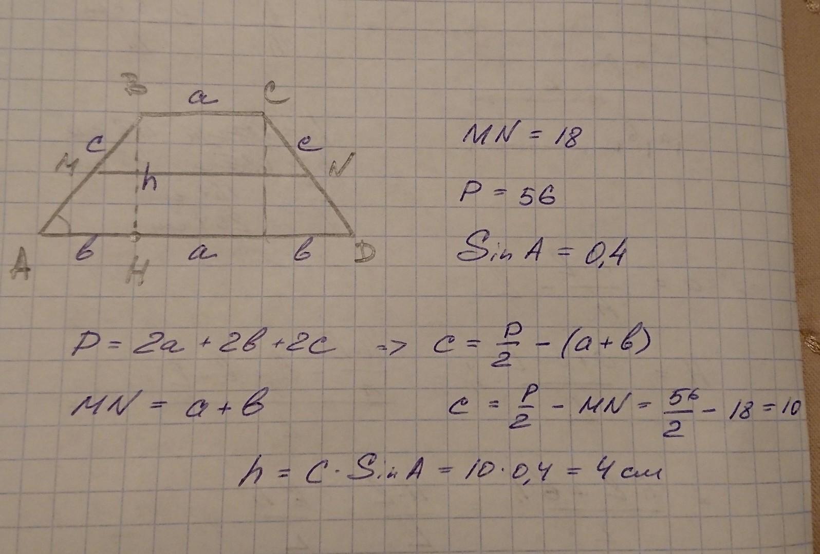В равнобедренной трапеции ABCD с основаниями AD и BC длина средней линии MN равна 18 периметр трапеции 56, а синус острого угла 0,4. Найдите высоту BH.