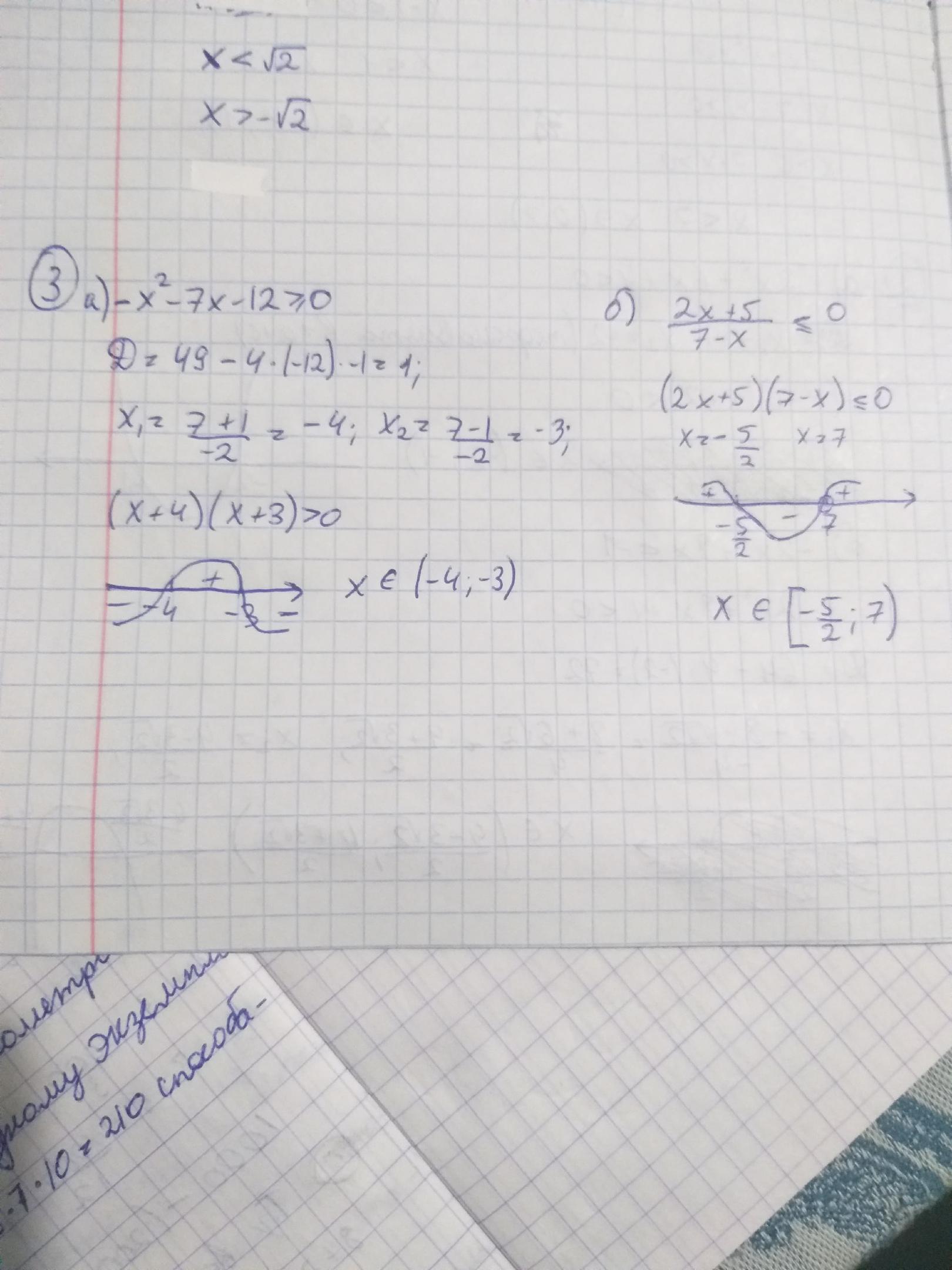 а) - х2 - 7х - 12 ≥ 0; б) (2х +5)/ (7 – х) ≤ 0;