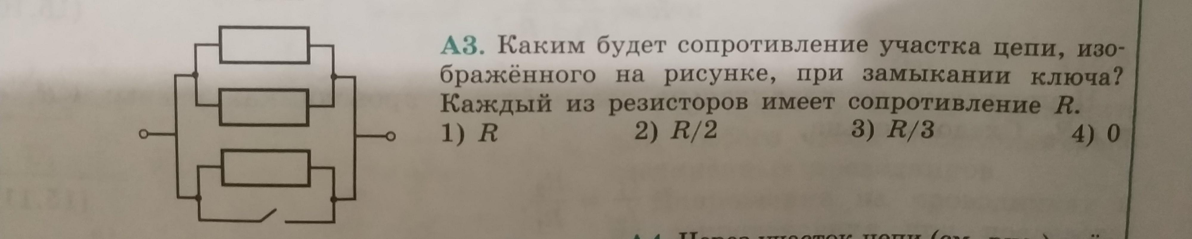Каким будет сопротивление участка цепи, изображенного на рисунке, при замыкании ключа? Каждый из резисторов имеет сопротивление R