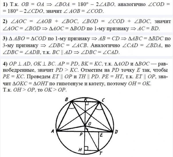 На окружности с центром О последовательно отмечены точки А, B, C, D так, что прямые AD и ВС параллельны, точка О лежит между ними, AD > BC и угол OBA = углу OCD.