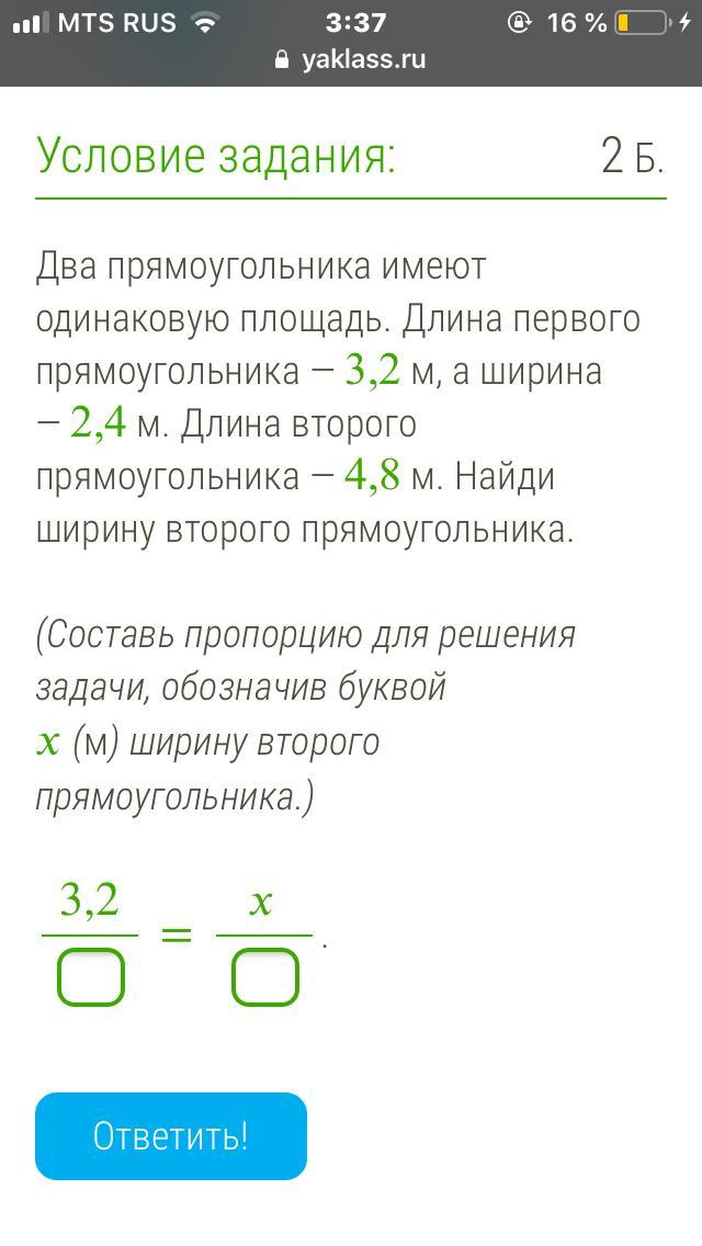 так как площадь одинаковая, то отношение соответственных элементов одинаковое, то есть длина1/ширина1 = длина2/ширина2, отсюда получаем: 3,2/2,4 = 4,8/x
