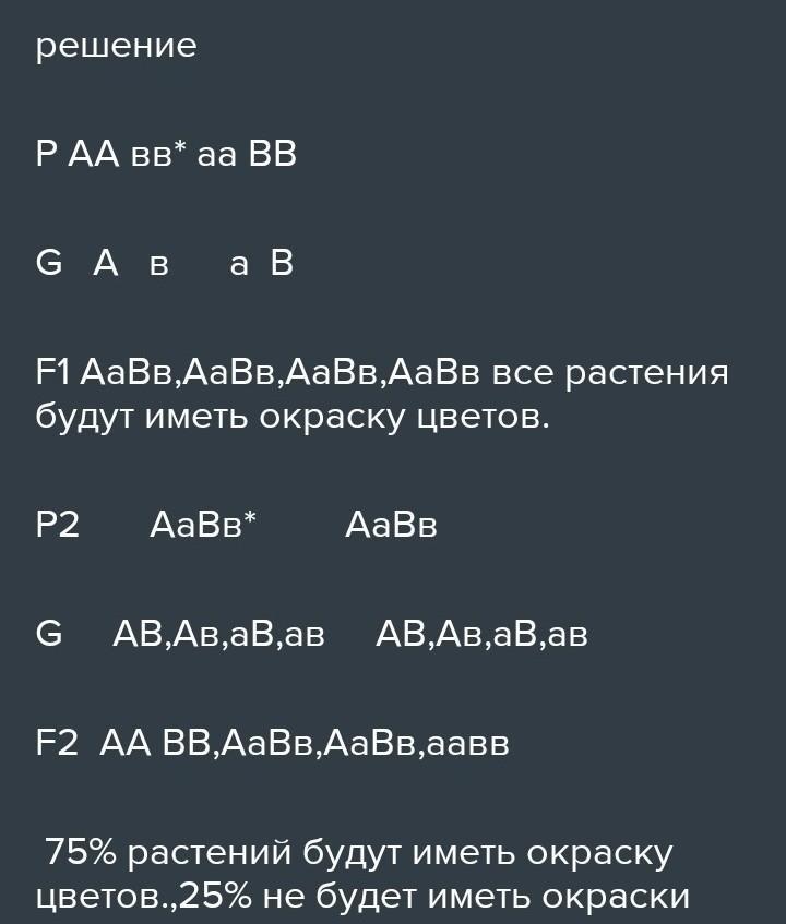 У душистого горошка окраска цветов проявляется только при наличии двух доминантных генов А и В. Если в генотипе имеется только один доминантный ген, то окраска не развивается. Какое потомство F1 и F2 получится от скрещивания растений с генотипами ААвв и ааВВ? Определите принцип наследования.