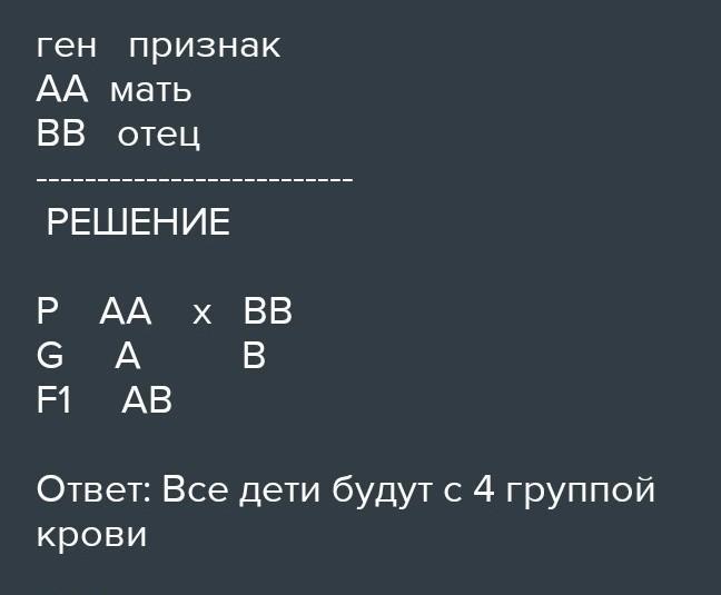 Мать гомозиготная, имеет А (II) группу крови, отец гомозиготен, имеет В (III) группу крови. Какие группы крови возможны у их детей? Определите принцип наследования