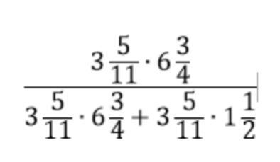 верхнюю и нижнюю части одинаковые сокращаем, остаётся внизу 3 5/11*1 1/2, а сверху 1. Перемножаем нижнюю часть: 57/11=5 2/11. И получается 1 / 5 2/11