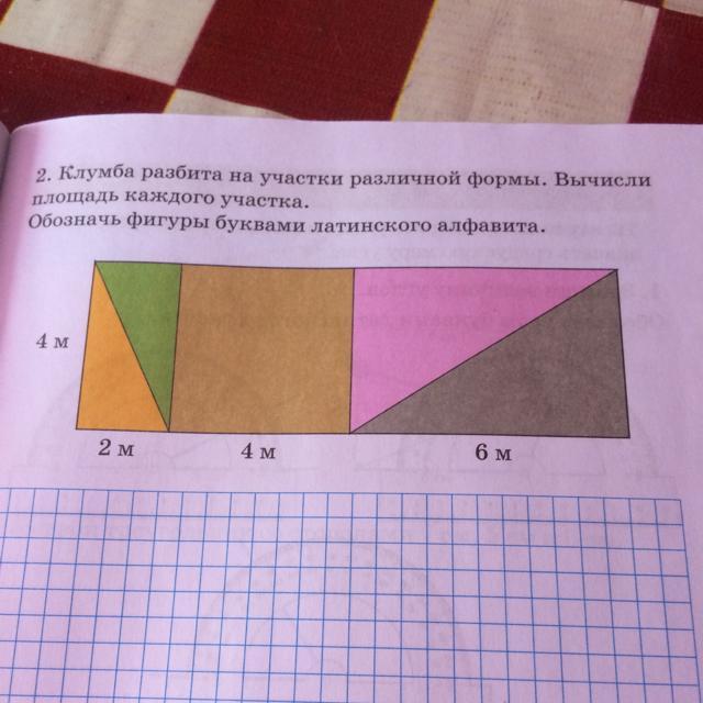 Жёлтый и зелёный треугольники = 4*2:2=4 м^2