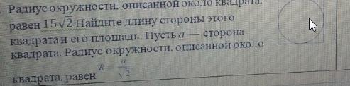 Объяснение: а=R×√2=15√2×2=30√2 это сторона квадрата, S=30√2×30√2=1800 это площадь