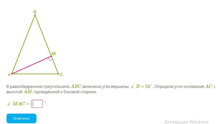 В равнобедренном треугольнике ABC величина угла вершины ∡ B = 52°. Определи угол основания AC с высотой AM, проведённой к боковой стороне.