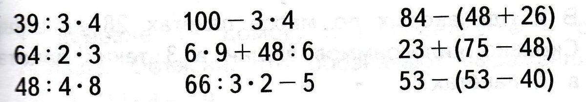 39÷3×4=52 100-3×4=88 6×9+48:6=62 66÷3×2-5=39