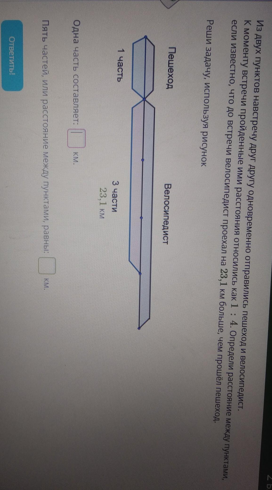 х = 21,3 : 3 = 7,1 км (прошел пешеход до встречи с велосипедистом).