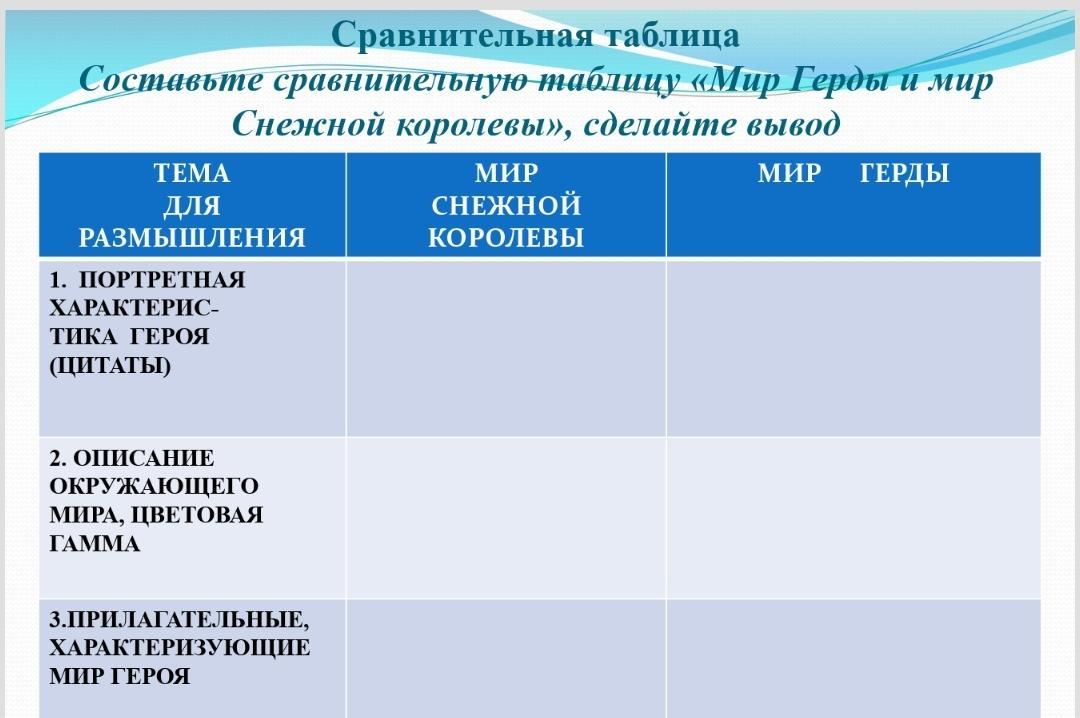 Помогите мне пожалуйста. Нужно составить сравнительную таблицу Снежной королевы и Герды. Произведение Снежная королева. Буду очень благодарен. Заранее спасибо.