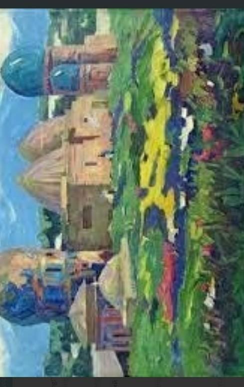 1.На этой картине видно пол-Самарканда.2. Посажены ярко-жёлтые цветы.3. Когда ты смотриш на неё будто видишь кадр из кинофильма. 4. Огромное бежево-жёлтое здание с синими купалами похожее на красивый замок.5. Ярко-синее небо на втором плане.