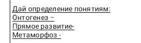 Онтогенез — индивидуальное развитие организма от начала существования до конца жизни. В онтогенезе животных выделяют два периода — эмбриональный и постэмбриональный.Прямое развитие — это тип развития, при котором новорождённый или вылупившийся из яйца организм по своему строению не отличается от взрослого организма, поскольку у него нет специфических органов или структур, но неполовозрелый и имеет меньшие размеры. Дальнейшее его развитие связано с ростом и половым созреванием.МЕТАМОРФО́З