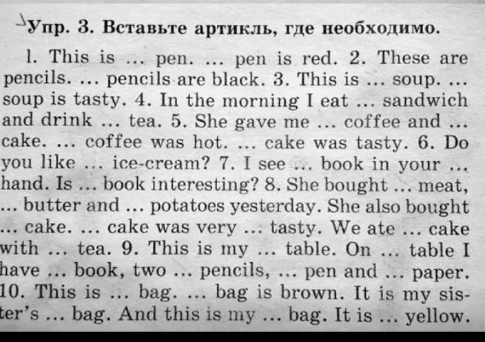 1. This is a pen. The pen is red. 2. These are pencils. The pencils are black. 3. This is soup. The soup is tasty. 4. In the morning I eat a sandwich and drink tea. 5. She gave me coffee and a cake. The coffee was hot. The cake was tasty. 6. Do you like ice cream? 7. I see a book in your hand. Is the book interesting? 8 She bought meat, butter and potatoes yesterday. She also bought a cake. The cake was very tasty. We ate the cake with tea. 9. This is a bag. The bag is brown. It is my sister's bag. And this is my bag. It is yellow.