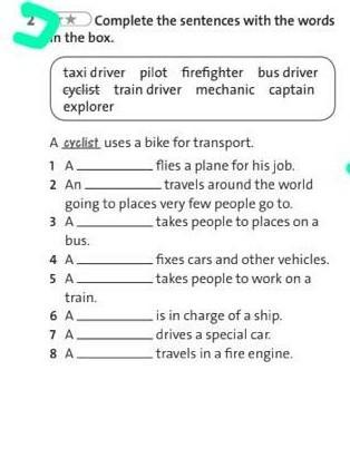 1 explorer 2.pilot 3.bus driver 4. mechanic 5. train driver 6. captain 7. cyclist 8. firefighter