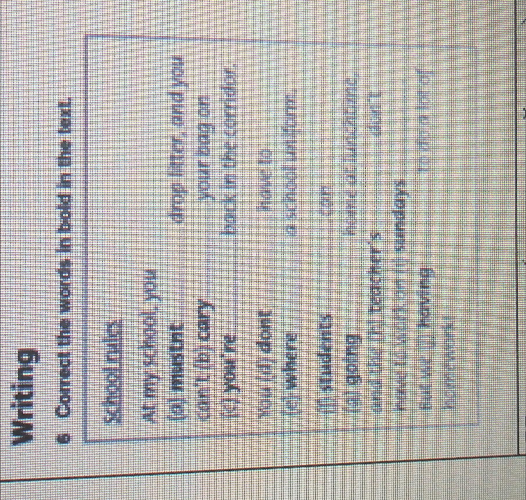 1) At my school you mustn't drop litter, and you can't carry your bag on your back in the corridor. You don't have to wear a school uniform. Students can go home at lunchtime, and the teachers don't have to work on Sundays. But we have to do a lot of homework!