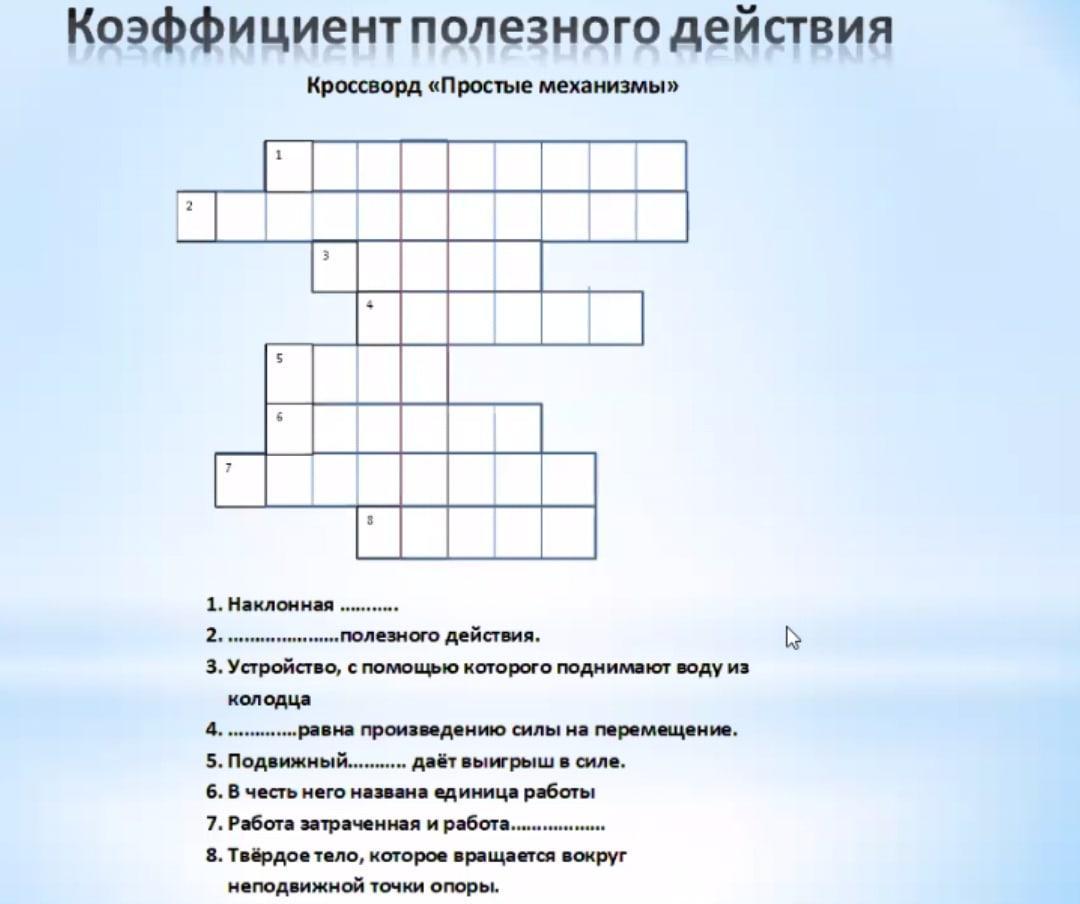 Плоскость, коэффициент, ворот, работа, блок. джоуль, полезная, рычаг.