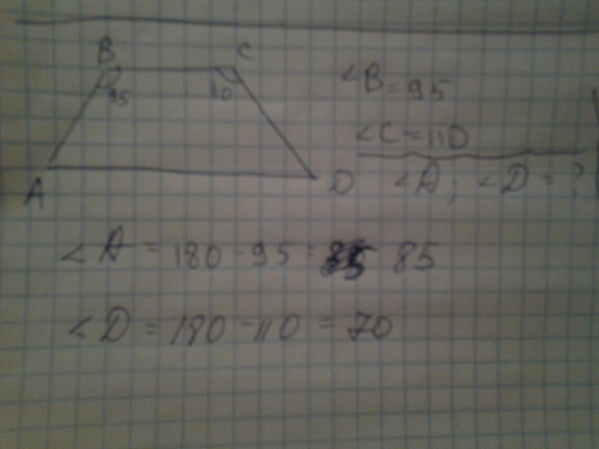 В трапеции АВСД с основаниями АД и ВС угол В равен 95 градусов , а угол С равен 110 градусов. Найдите остальные углы трапеции