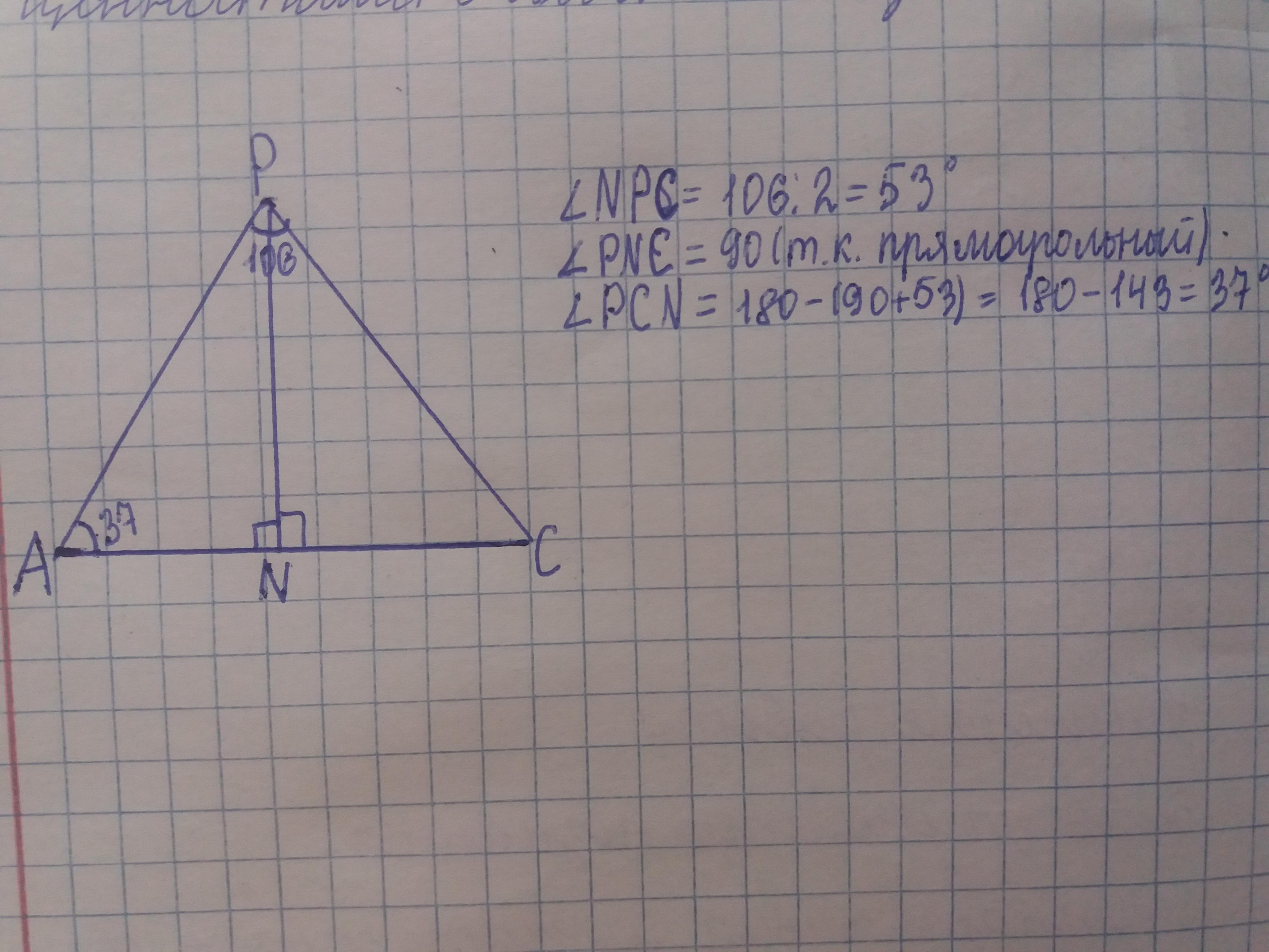 В треугольнике APC проведена высота PN известно что Угол PACравен 37 градусов и Угол APC равен 106 Определите углы треугольникаNPC