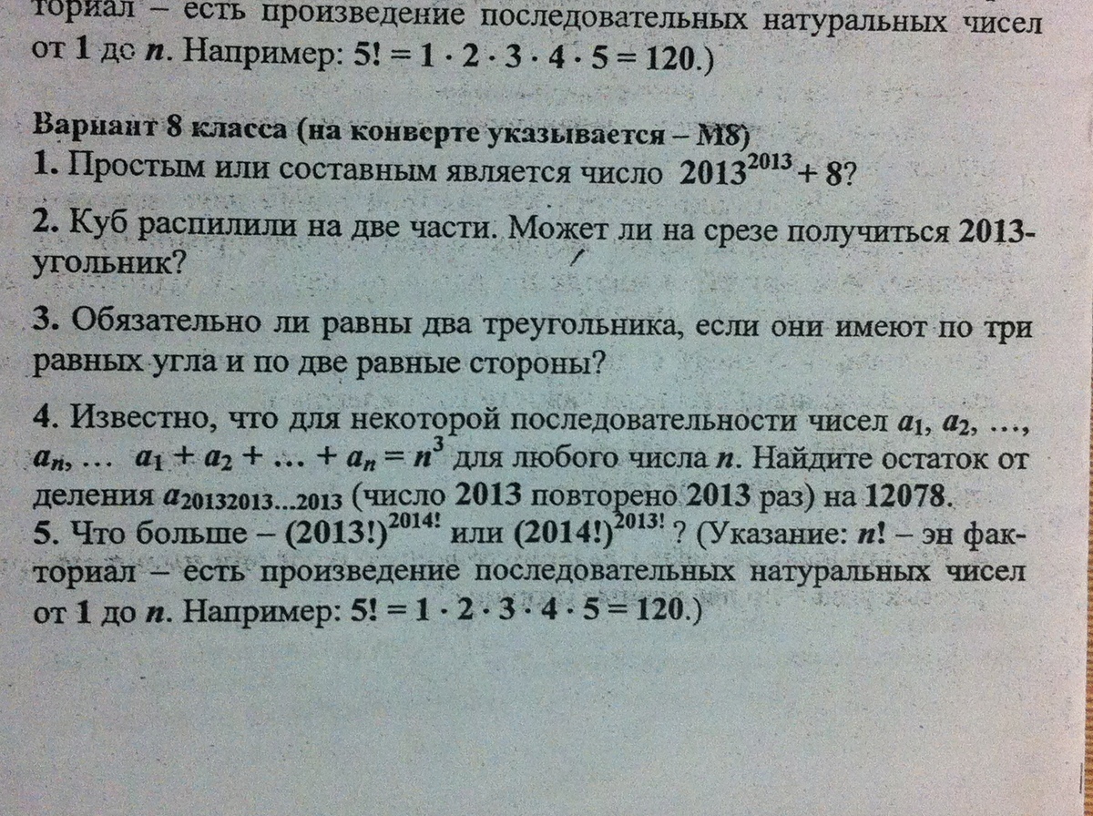 5. Что больше - (2013!)^2014! или (2014!)^2013!? (Указание: n! - эн факториал - есть поизведение последовательных натуральных чисел от 1 до n. Например: 5! = 1*2*3*4*5=120)