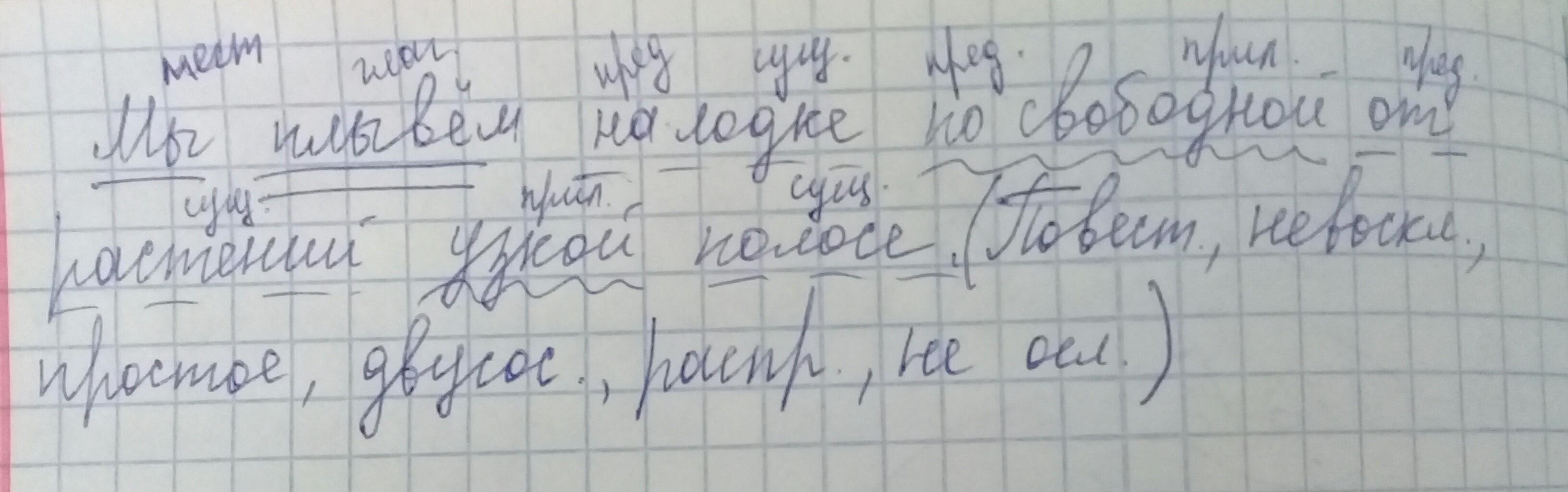 Выполнить синтаксический разбор предложения - Мы плывём на лодке по свободной от растений узкой полосе.