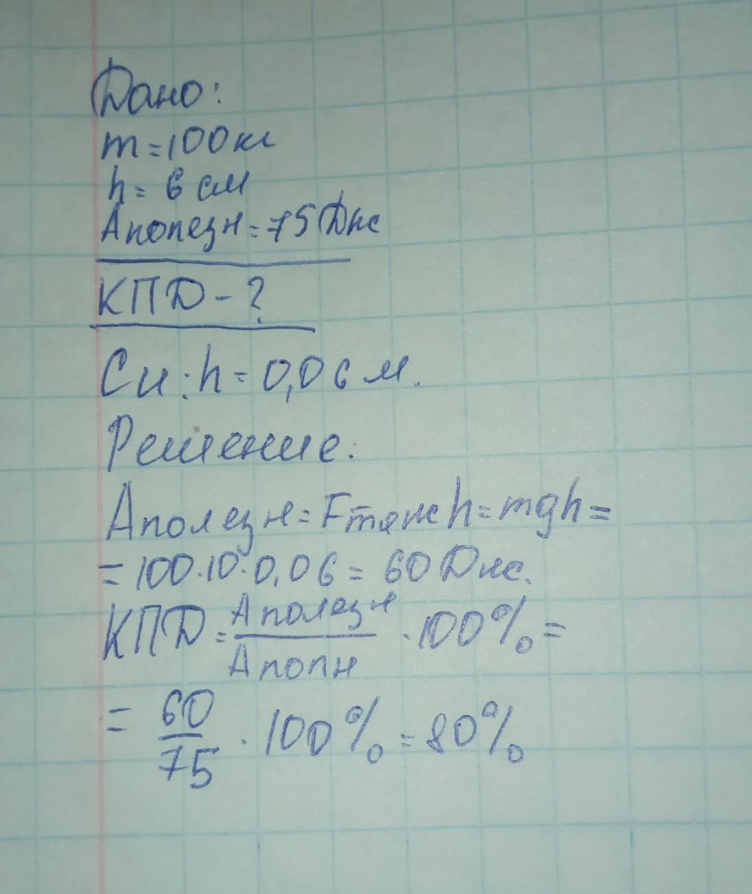 с помощью рычага подняли груз массой 100кг на высоту 6 см при это совершили работу 75Дж определите КПД рычага