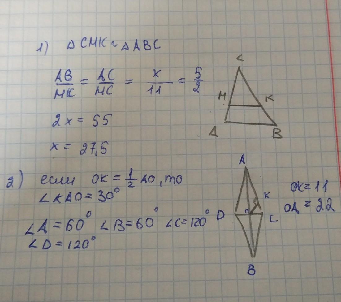 1)Прямая, параллельная стороне АВ треугольника АВС, пересекает стороны АС и ВС в точках М и К соответственно. Найдите АВ, если СМ : МА = 2:3, МК = 11.