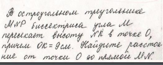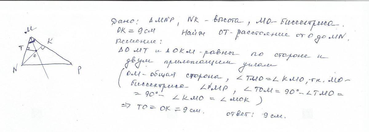 В остроугольном треуг MNP биссектриса угла M пересекает высоту NK в точке O, причём ОК равно 9 см. найти расстояние от О до MN помогите